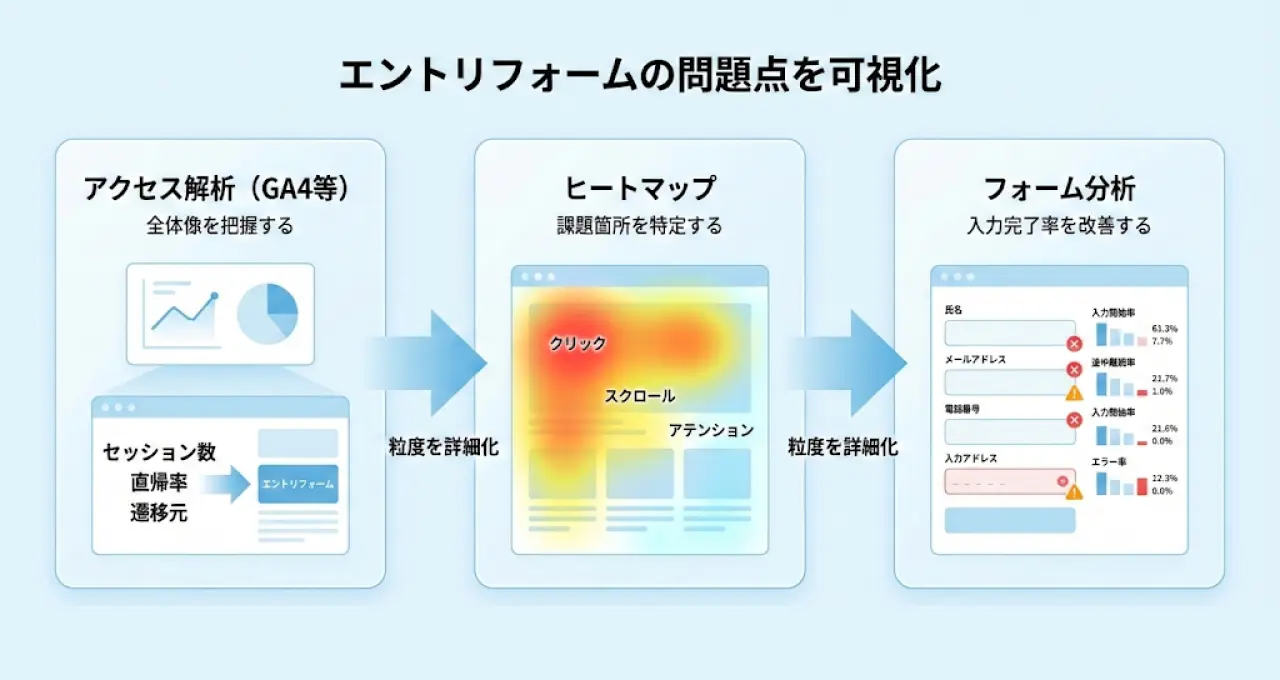 | 主指標 | 直帰率、CTAクリック率、フォーム到達率、CVR | 入力開始率、エラー率、完了率、フォーム離脱率 |