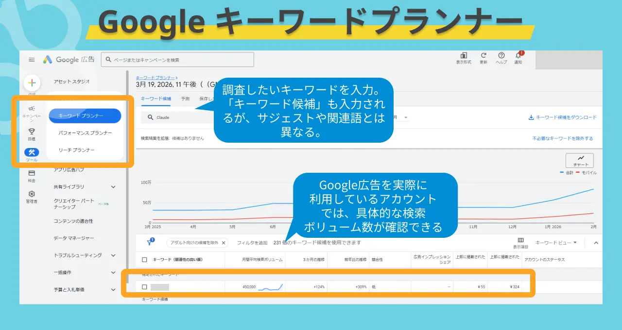 GoogleキーワードプランナーはGoogle広告運用向けのツールで、キーワードの月間検索ボリュームの目安が提供されることからSEOでも活用されています。