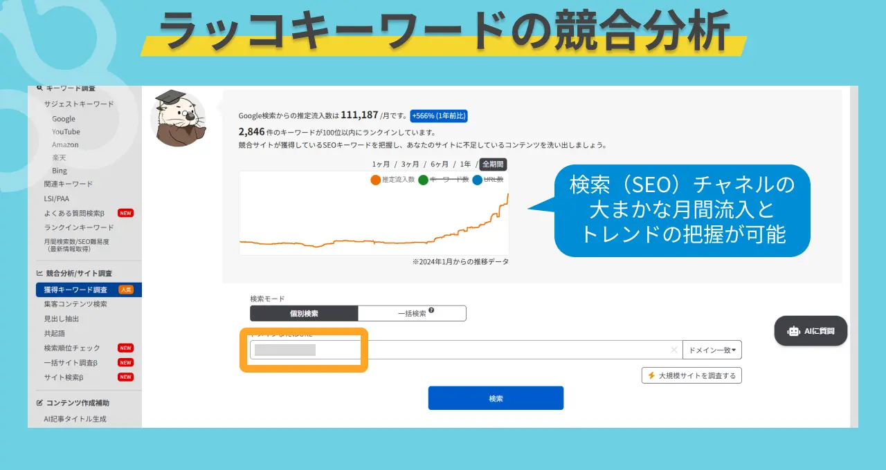 ラッコキーワードは、キーワード発見、検索意図の把握、競合分析、AIによる制作補助までを一貫して支援してくれる便利なツールです。